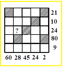 Şekildeki sayı bulmacasından taralı alanlar hariç olmak üzere diğer karelere, 1 den 10 a kadar olan sayıların tümü her satır ve her sütunda yalnız iki tane sayı olacak şekilde yazılacaktır. Karelerin dışındaki sayılar o satır ve sütundaki sayıların çarpımıdır.